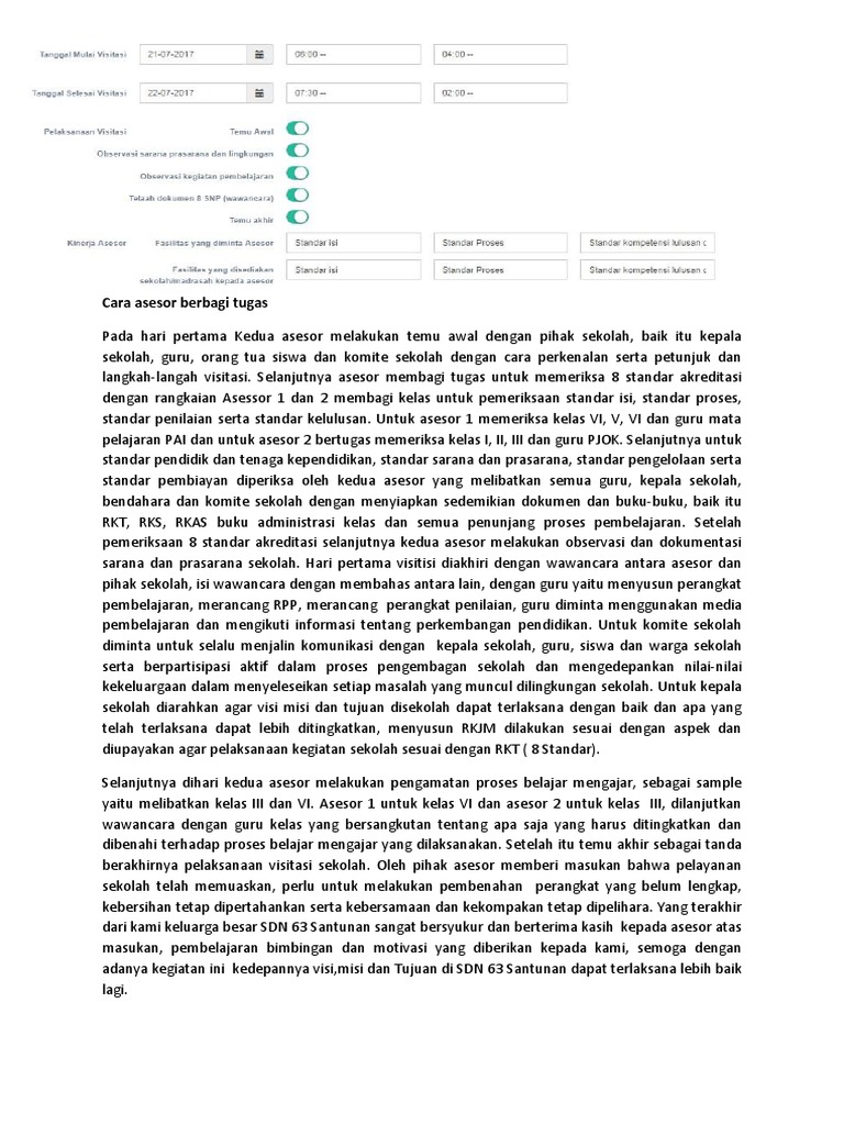 Kinerja Asesor Fasilitas yang diminta Asesor Fasilitas yang disediakan sekolahmadrasah kepada asesor Cara asesor berbagi tugas Suasana Pelaksanaan Visitasi 01-01-1970 01-01-1970 SisPenA SM - Kartu. Info Pendaftaran Calon Asesor Program Sekolah Penggerak PSP Tahun 2021. A1 Instrumen Akreditasi yang telah diisi beserta data dukungnya a2 Bukti fisik setiap standar a3 Ruang dua kelas untuk visitasi Kegiatan Belajar Mengajar a4 Ruang visitasi a5 Rekap nilai akreditasi c.